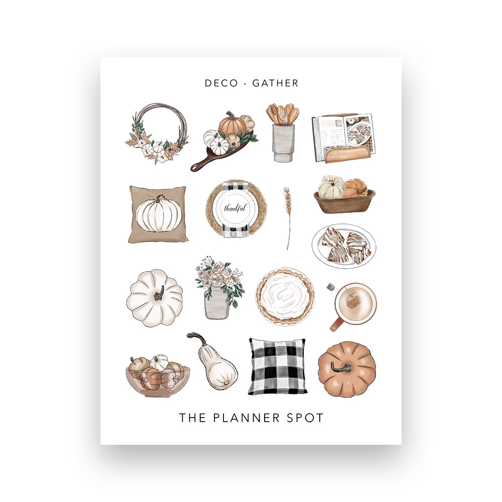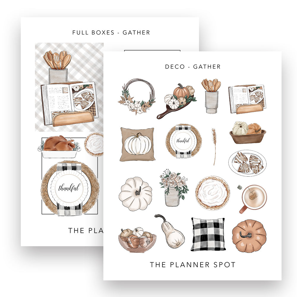 Decorative cutout and full box stickers themed for Thanksgiving or a Fall dinner gathering.
